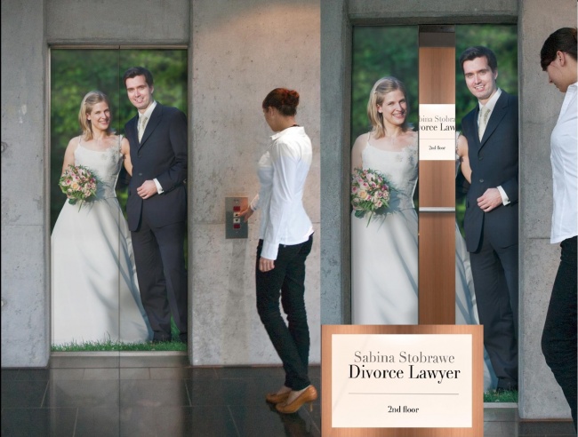 Se trata de una foto tradicional de una boda pero que al abrirse el ascensor, la pareja se separa súbitamente y aparece en el fondo la publicidad de este despacho en Alemania.