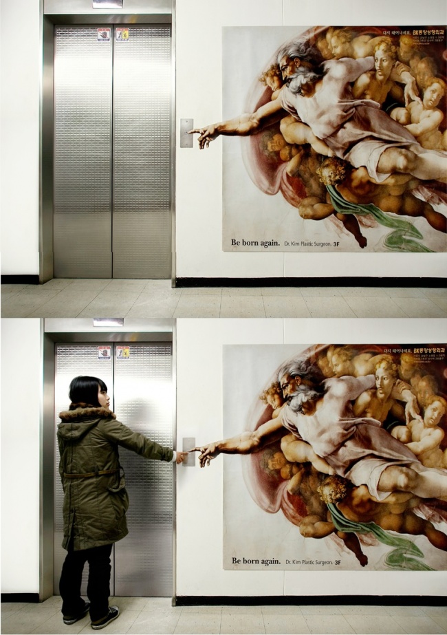 La famosa pintura de Miguel Ángel, La creación de Adán, es usada de manera creativa como publicidad para llegar el consultorio del cirujano plástico.