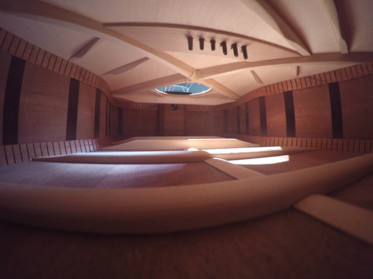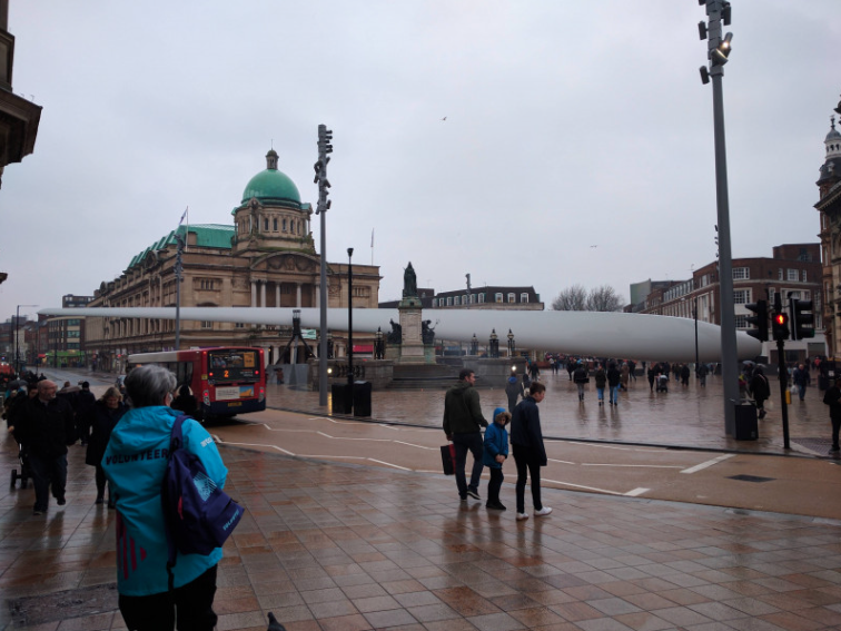 Esta el aspa del motor de un molino de viento en medio de la ciudad.