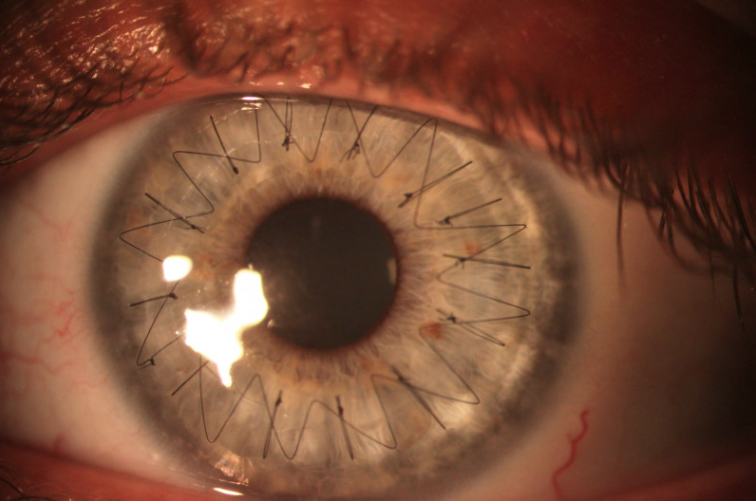 Fotografía de un ojo humano después de un trasplante de córnea.