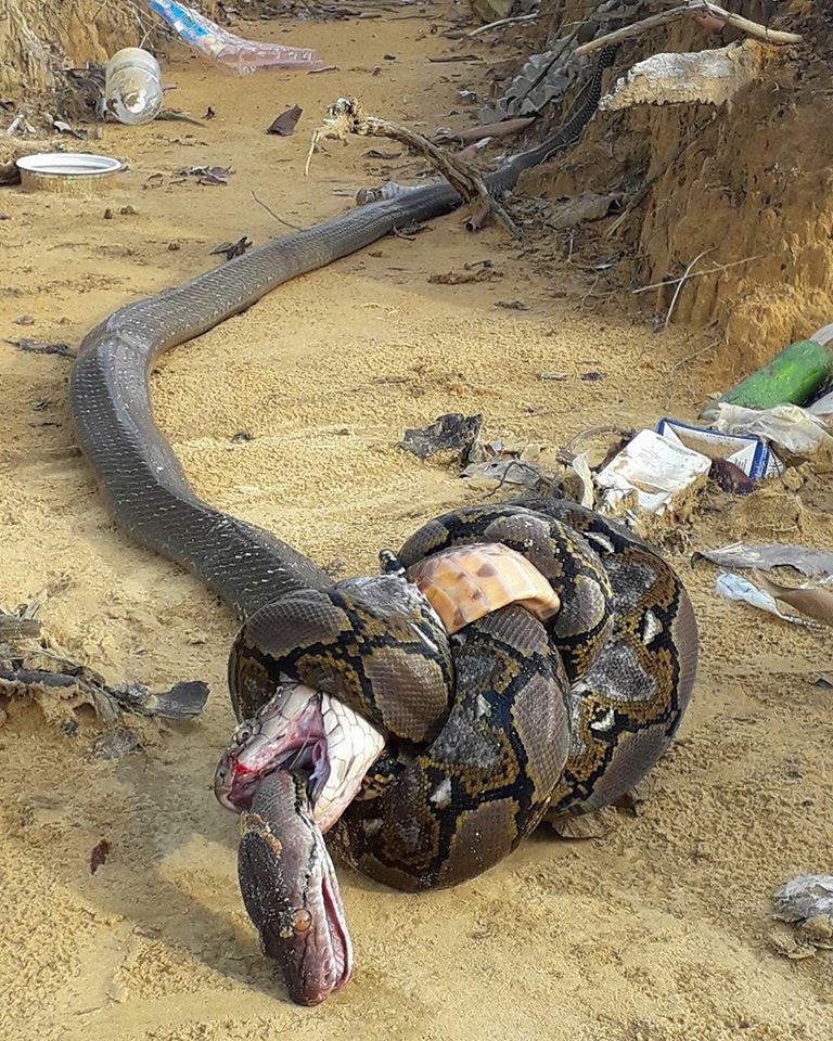 Imagen impactante de una lucha entre una pitón asfixiando a una cobra y ésta inyectando su veneno. Las dos murieron.
