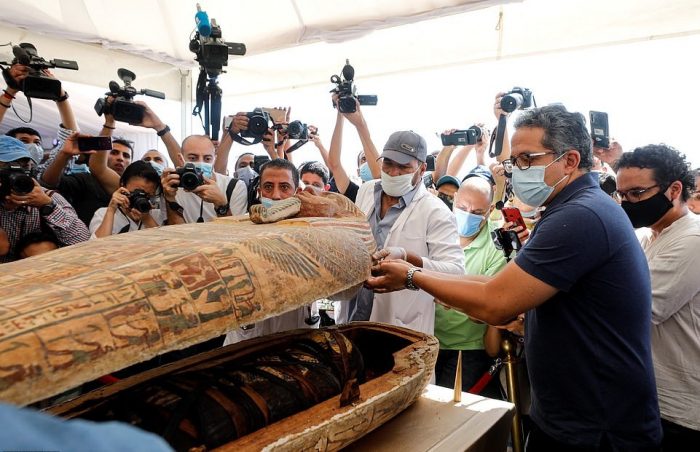 “Mis colegas del Consejo Supremo de Antigüedades descubrieron pozos de entierro llenos de ataúdes de madera, sellados e intactos”, dijo el Ministro.