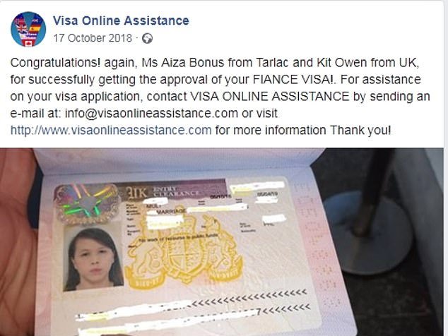 “Felicitaciones nuevamente, Sra. Aiza Bonus de Tarfac y Kit Owen del Reino Unido por obtener la aprobación de su visa de prometida”, escribieron en la página web de Visa Online Assistance tras la aprobación de su visado.