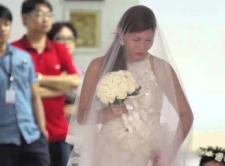 Una imagen sumamente triste de una novia que estaba a punto de perder a su novio ya que iba a morir de cáncer unas horas después, aquí camina sola al altar.