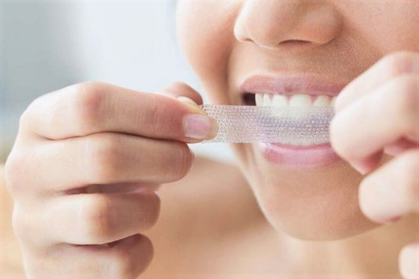 Las tiras blanqueadoras incluyen una capa delgada de gel de peróxido sobre tiras plásticas. La mayoría de las opciones sugiere que se deben aplicar dos veces al día durante 30 minutos y que pueden aligerar los dientes en uno o dos tonos. Un estudio de 2016 publicado en Clinical Oral Investigations señala que no hay evidencia de que las tiras de blanqueamiento sean más efectivas que el gel de peróxido de carbamida al 10%.