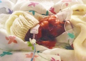 Jay y Katie solo tocaron su mano por unos segundos antes de que lo pusieran en una máquina de respiración usando el tubo más pequeño posible por su pequeña garganta.