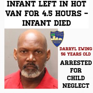 Darryl Ewing estacionó la camioneta frente a la guardería y dejó al bebé atado en la tercera fila de la camioneta sin vigilancia hasta la tarde con la camioneta estacionada al sol. Los empleados de la guardería se dieron cuenta de que el bebé había desaparecido solo después de que su madre llamó para hacer arreglos para recogerlo a las 1:03 p.m., según la policía.