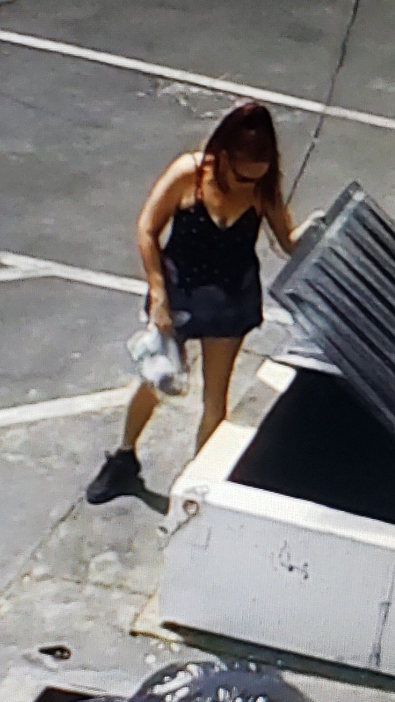 La policía la identificó después de que fue capturada en cámara. Ella llegó en un Jeep blanco hasta un contenedor de basura detrás de una tienda y rápidamente arrojó una bolsa de plástico con 7 cachorros en ella.