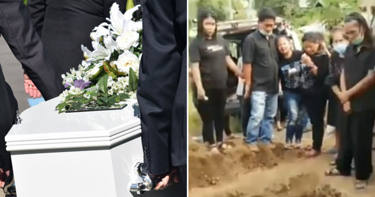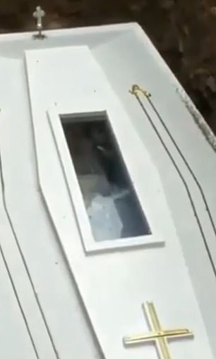 El horrible clip, filmado en Manado, Indonesia, muestra a familiares y amigos afligidos reunidos alrededor del ataúd mientras un sacerdote lee una oración.