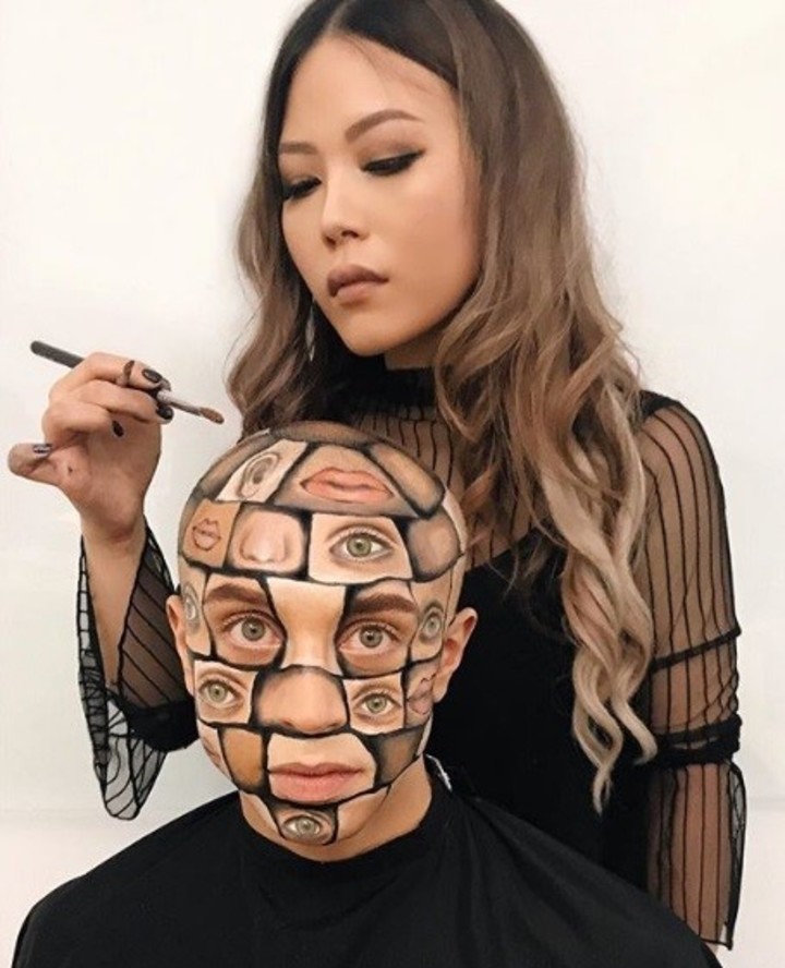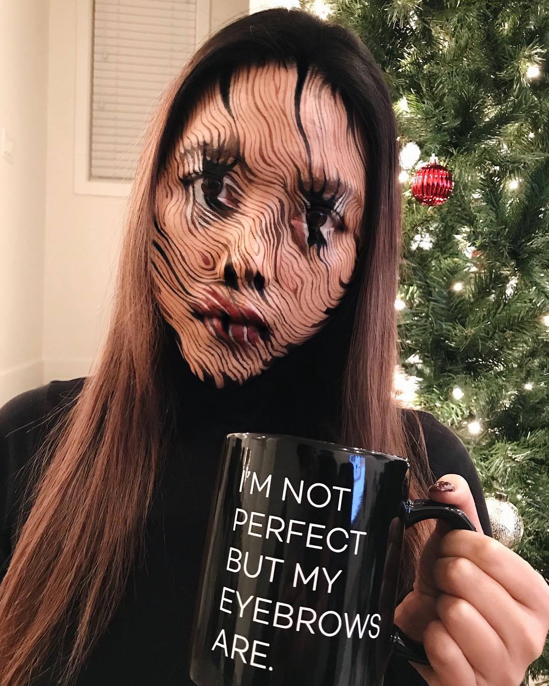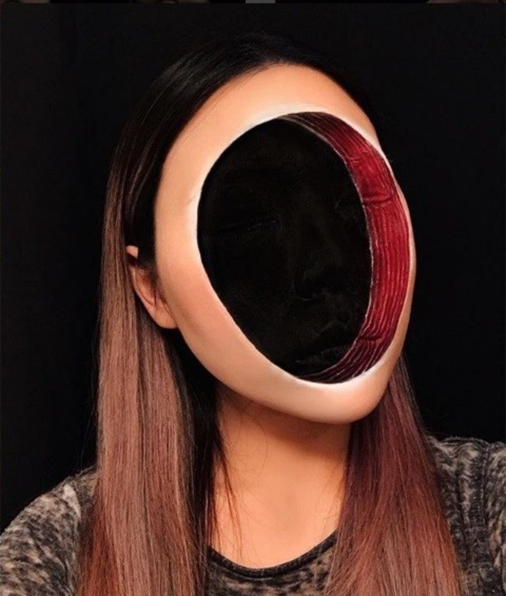 Lo más impactante de todo, es que, ademas de maquillar a modelos que se prestan para sus trabajos, generalmente su lienzo principal es su propia cara, lo cual aumenta considerablemente la dificultad, pero para ella no parece un problema.