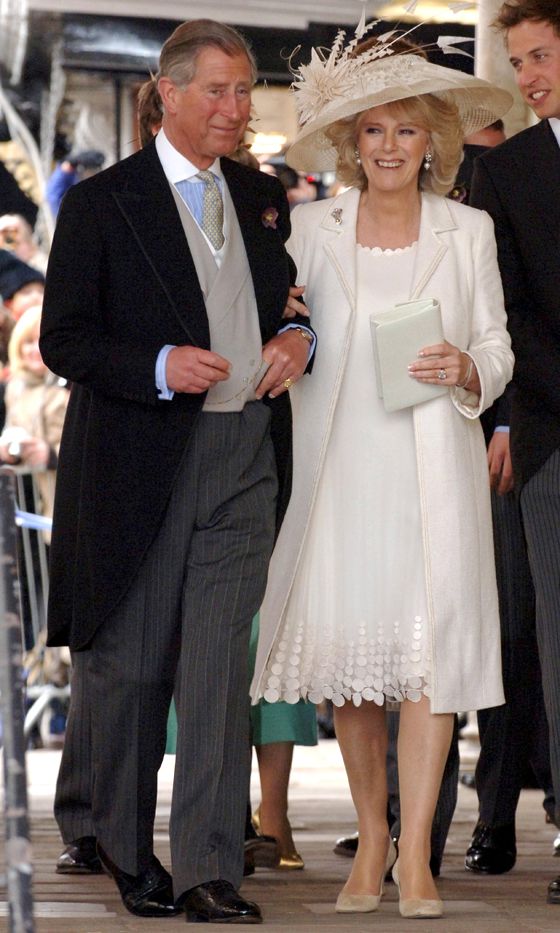 Camilla en su boda civil lució muy elegante con un vestido blanco, un abrigo de hilo de seda, además de una pamela de paja con encaje francés. Los zapatos combinaban a la perfección pues eran de color beige. Ella prefirió llevar una cartera de cuero en vez del tradicional ramo. Habían más de 1000 policías y miembros del ejército cuidando a todos los asistentes. Este operativo tuvo un costo de casi dos millones de libras.