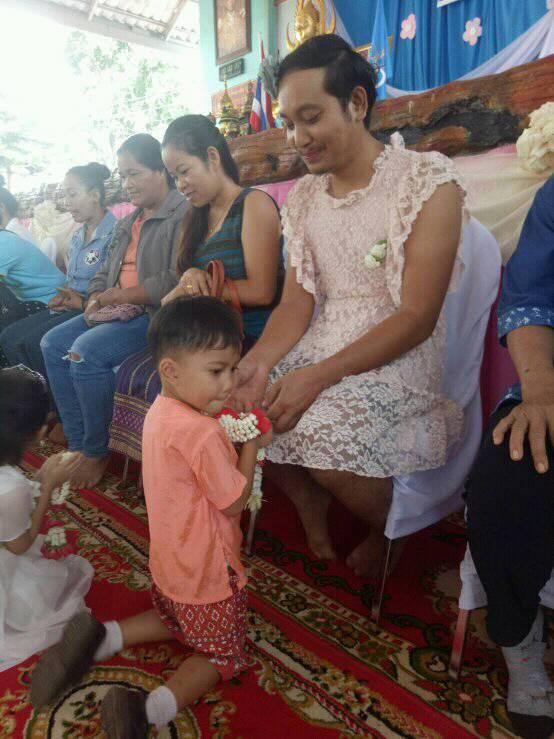 Chatchai “Sam” Panuthai decidió utilizar un vestido de encaje rosa para acompañar a sus queridos hijos, Imsome, de 3 años, y Ozone, de 5.