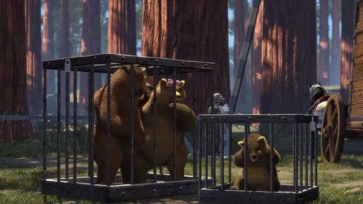 En la secuencia de imágenes, podemos ver a la familia de osos enjaulada por orden de Lord Farquaad, el villano de la película. Papá oso y mamá osa en una jaula, y el bebé oso en otra.