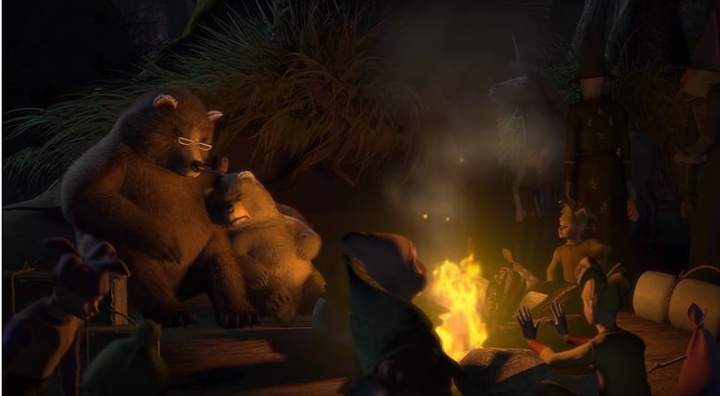 En la siguiente aparición, se observa al padre y al hijo junto al resto de personajes de cuentos de hadas en el pantano de “Shrek”, luego de ser desterrados por el malvado Farquaad. Papá oso se encuentra consolando a su pequeño hijo.