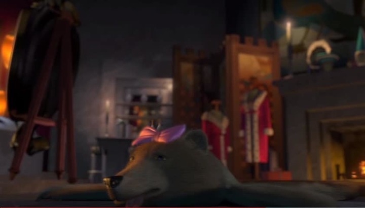 Minutos después, en otra escena en el dormitorio de Lord Farquaad, podemos ver una alfombra de piel que tiene una cara muy parecida a Mamá oso, quien no vimos en la fogata con los demás personajes.