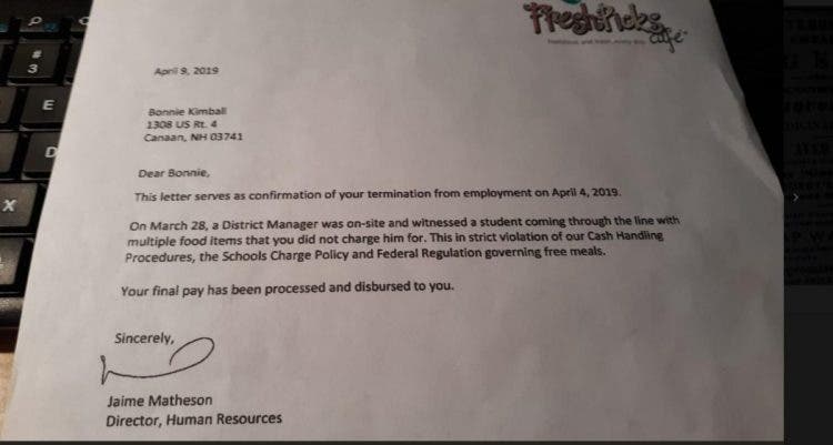 Al punto de quedarse sin empleo tras casi 5 años trabajando para una empresa que provee la alimentación al comedor de una escuela secundaria. Bonnie trabajaba para Fresh Picks Cafe, una subsidiaria de Cafe Services, en la escuela regional de Mascoma Valley.