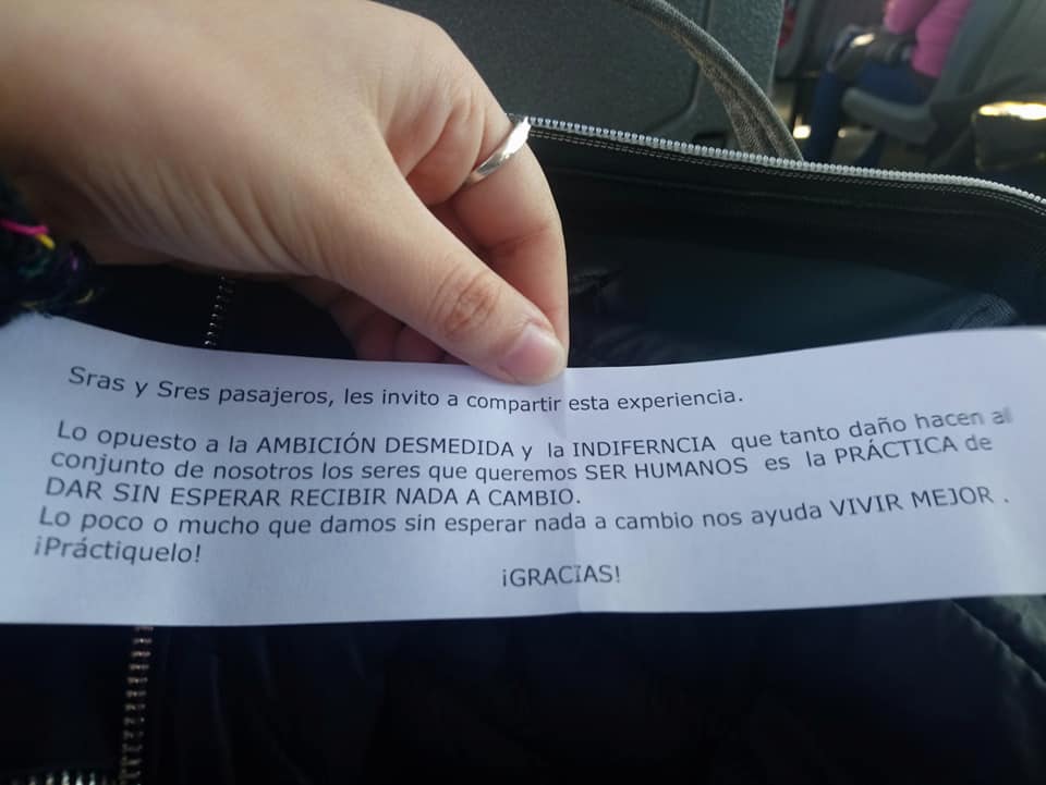 “Señoras y señores pasajeros, los invito a compartir esta experiencia. Lo opuesto a la ambición desmedida y la indiferencia, que tanto daño hace a los seres que queremos ser humanos, es la práctica de dar sin esperar nada a cambio. Lo poco o mucho que damos sin esperar nada a cambio nos ayuda a vivir mejor. ¡Practíquenlo!”.