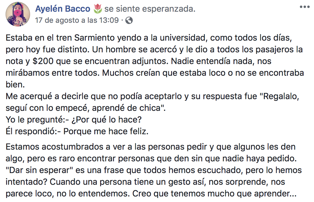“La plata estaba envuelta en un papel, todos pensamos que estaba pidiendo alguna colaboración. Algunos pasajeros lo ignoraban y el hombre les sonreía y les decía: Qué Dios lo bendiga”.