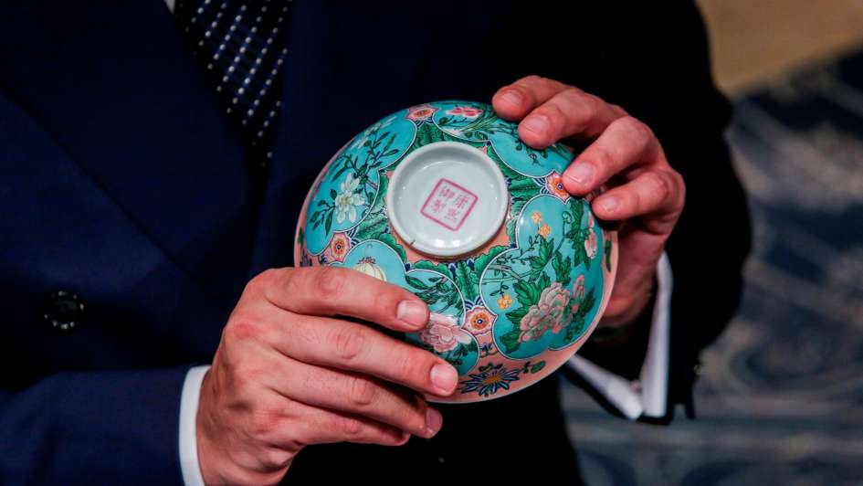 La pieza artística es del siglo XVIII, y tenía como fin ser un regalo para el emperador chino Kangxi. El tazón está decorado con diferentes motivos florales, combinando técnicas chinas y occidentales, lo cual la convierte en toda una rareza.