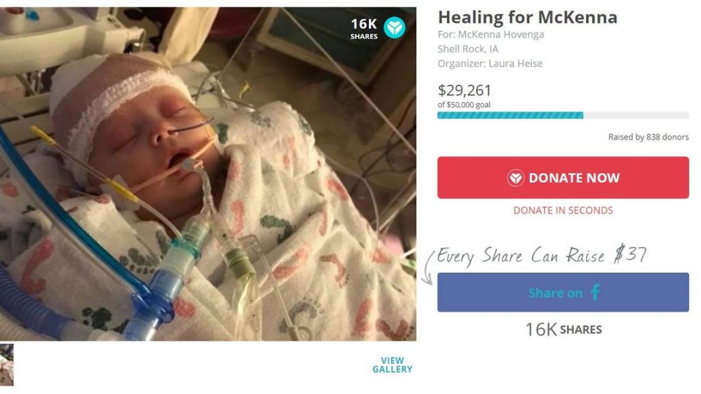 A pesar de que el estado de la pequeña McKenna es hasta ahora estable, aún se encuentra en un periodo crítico. Por este motivo, sus padres lanzaron una campaña para recolectar fondos que les ayuden a cubrir los gastos de hospitalización.