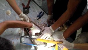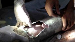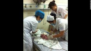 Entonces cortaron toda la tubería, con el bebé aún adentro, y llevaron la sección a un hospital en Jinhua. Trabajando juntos, los médicos y los rescatistas utilizaron unos alicates para extraer pedazos de la tubería, y finalmente revelaron al bebé, sus hombros y cabeza presionados contra el revestimiento de la tubería. La placenta todavía estaba adherida.