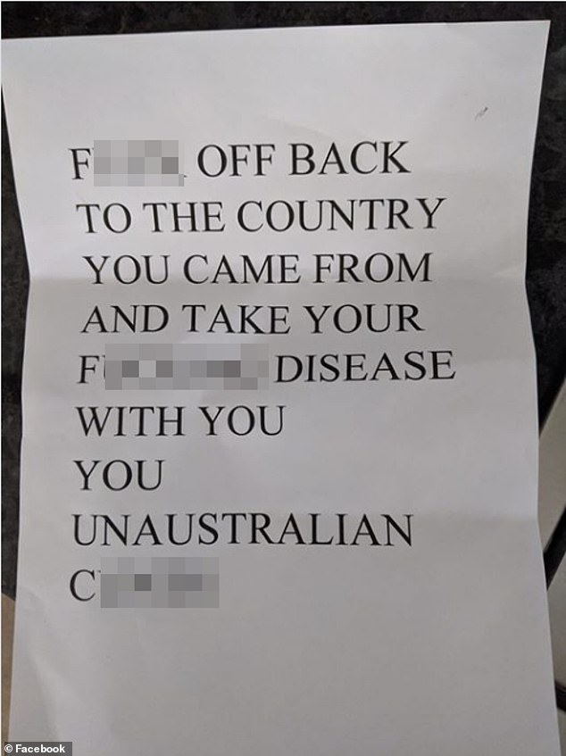 Una enfermera compartió una imagen de una carta abusiva que recibió su familia filipina en el buzón culpándolos de la crisis de Covid-19 de Australia.