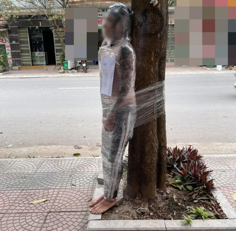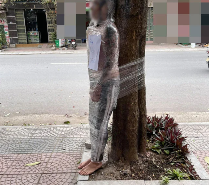 Y, sin embargo, esta fue la vista que algunos en Hanoi disfrutaron la semana pasada: un joven sin camisa con un casco de bicicleta, envuelto en plástico transparente y atado a un árbol, con un letrero que decía ” Odio pagar por tatuajes “. Las fotos del hombre se publicaron en línea y rápidamente se volvieron virales.