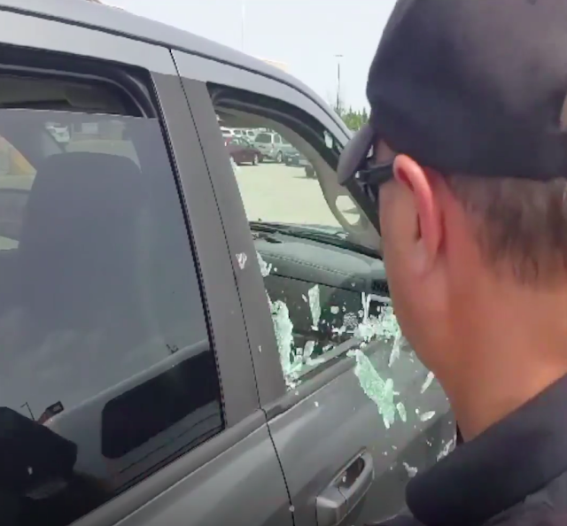 El oficial no perdió mucho tiempo en tratar de buscar quién era el dueño de este vehículo. El perro que estaba dentro se veía muy mal por lo que el oficial decidió romper la ventanilla.