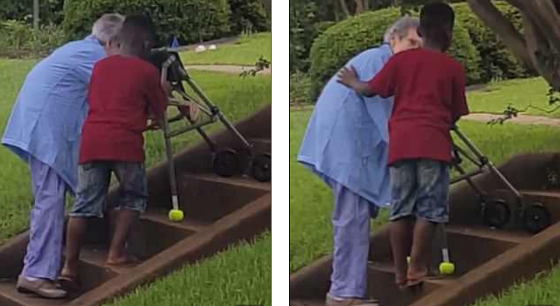 Se puede ver al pequeño Maurice ayudando a la dama a subir con su andador por cada escalón del video. Para mantener estable a la anciana, el niño mantiene su mano sobre su espalda mientras la ayuda a levantar el andador con la otra mano.