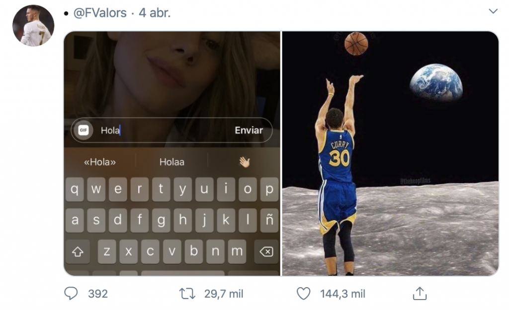 En la parte izquierda, intenta entablar conversación con Ester con un escueto ‘Hola’. hasta ahí, todo normal… Pero acompañó la captura de la respuesta con, la de Curry, una verdadera leyenda de la NBA, tratando de encestar en la luna