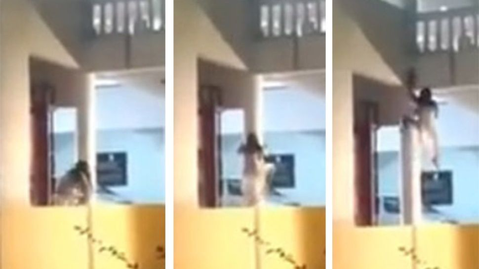 Están circulando imágenes donde una mujer, aparentemente poseída, trepa por una pared para subir a su departamento en Malasia.