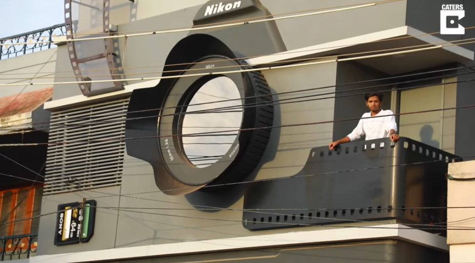 Pero como si la obsesión de Ravi por la fotografía no fuera ya obvia, decidió ponerla en exhibición completa al diseñar su casa de tres pisos como una cámara gris gigante con todo tipo de elementos relacionados con la fotografía, como una lente, un flash de cámara gigante. , Tarjeta SD, varios carretes de película, así como los nombres de sus hijos: Canon, Nikon y Epson.