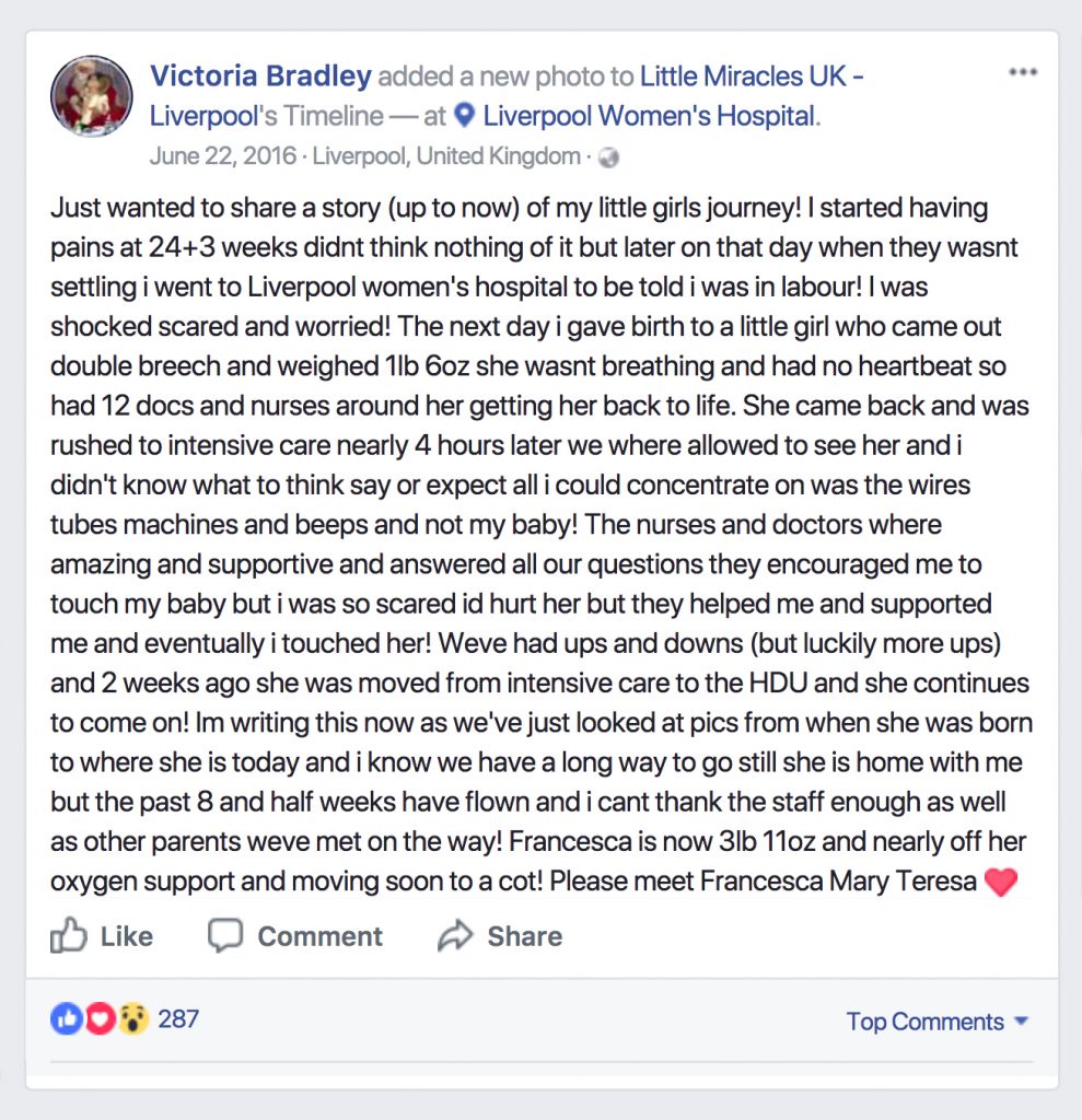 La recién nacida prematura, Francesca Bradley-Curran nació solo después de 48 horas después de la fecha límite real para recibir asistencia médica. Al ser tan prematura, fue difícil para ella sobrevivir. Pero después de 17 semanas, mostró una recuperación milagrosa.