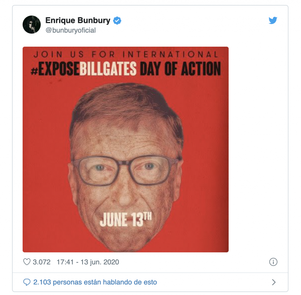 Las declaraciones de Bunbury están en sintonía con los recientes tuits de Miguel Bosé, en los que tilda a Bill Gates de «eugenésico», y asegura que «se olvida de la existencia de la maldita hemeroteca», porque «en el pasado habló reiteradamente de más, sobre su proyecto de vacunas que portasen micro chips o nano bots, bots, para obtener todo tipo de información de la población mundial con el sólo fin de controlarla».