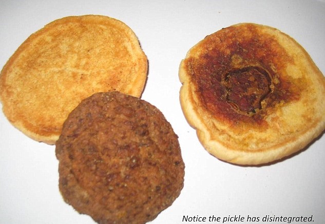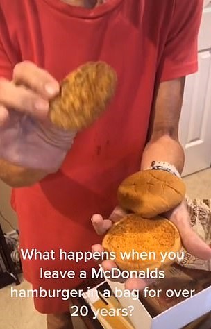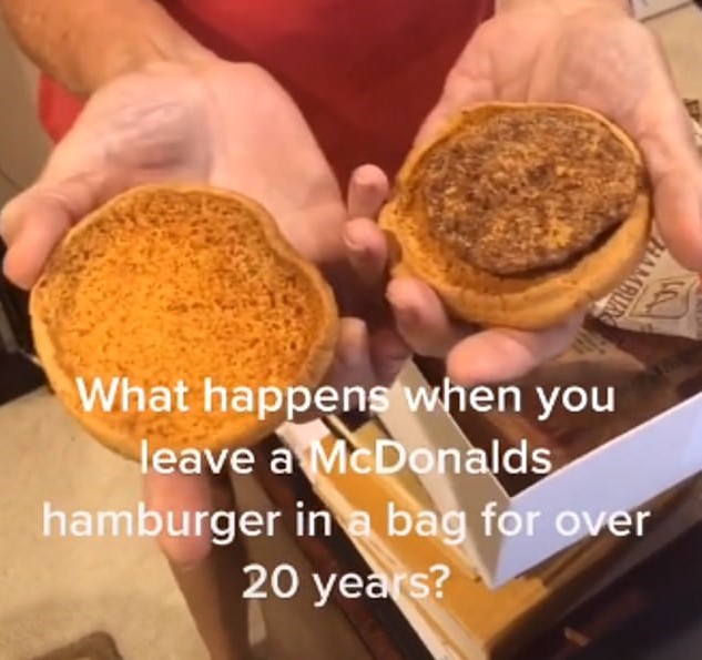 Luego abrió la hamburguesa y dijo: “La hamburguesa en sí, el pan nunca se ha moldeado, la carne nunca se ha podrido y nunca se ha roto. Está completamente intacto”.