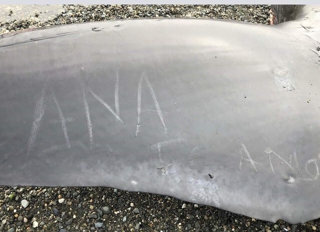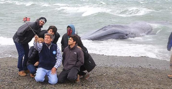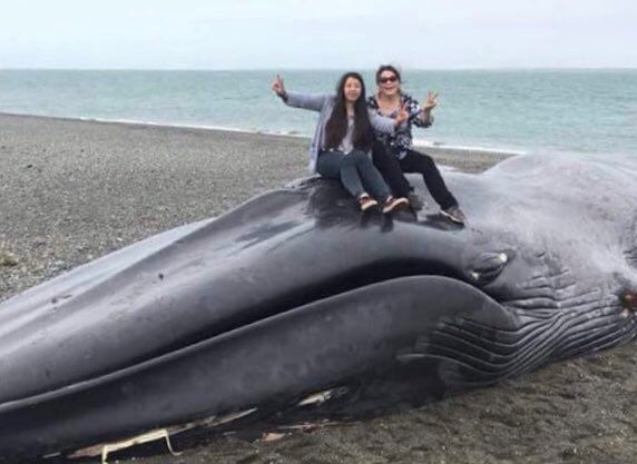 Al parecer, la ballena estaba agonizando y todavía no había muerto, pero eso no impidió que estas dos mujeres se saquen fotos con el animal y rayen su cuerpo escribiendo frases como “Ana te amo”.