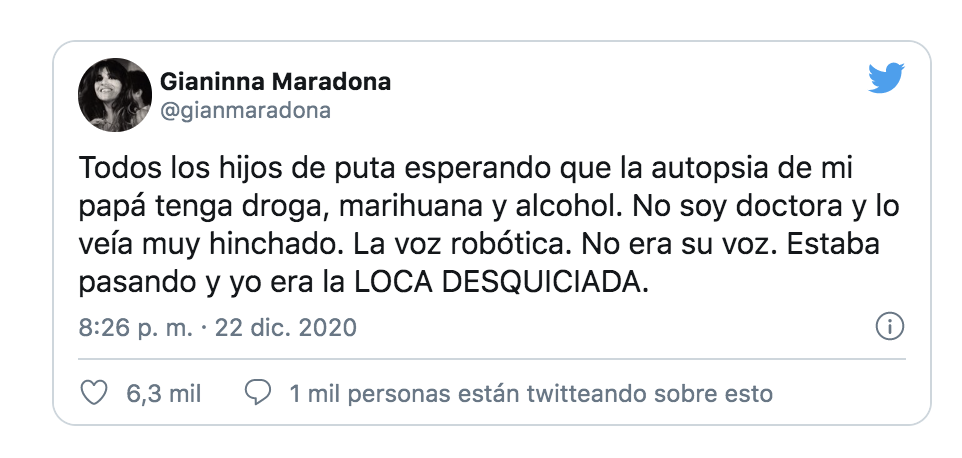 Y luego Gianinna hace referencia a las sospechas que tuvo de que su padre no recibió una atención médica adecuada por parte del personal que lo cuidaba en Buenos Aires, ya que Maradona estaba recuperándose de una operación por un hematoma cerebral.