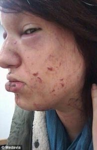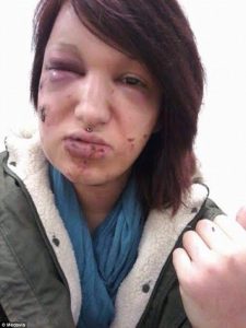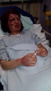 Ella explicó: ‘Los médicos me dijeron que tenía la cuenca del ojo derecho fracturada, la nariz y un pómulo rotos y laceraciones en todo el cuerpo”.