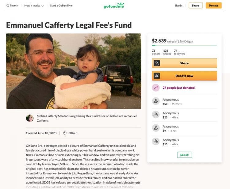 Cafferty indicó que aunque simpatiza con los movimientos de justicia racial, jamás ha hecho activismo político, acotó que ni siquiera tenía cuenta de Twitter antes del amargo episodio. Crearon una campaña en GoFundMe para ayudar a Emmanuel, hasta el momento han recolectado 7.000 dólares.