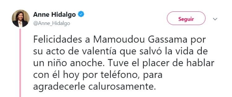 Finalmente, la alcaldesa quiso dar a conocer en su cuenta de Twitter, el apoyo que darían a Gassama para que regularice su situación en Francia. Por su parte, el presidente Macron lo condecoró por el valioso gesto y de la misma forma le ofreció ser naturalizado como francés, además de ofrecerle una plaza de trabajo dentro del Cuerpo de Bomberos de París.