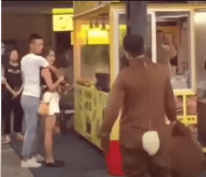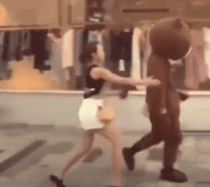 A medida que avanza el video, un hombre con un disfraz de oso pardo entra en el cuadro y se detiene ante ellos. El tipo de disfraz de oso se quita la ‘cabeza de oso’ y mira con incredulidad a la pareja frente a la tienda.