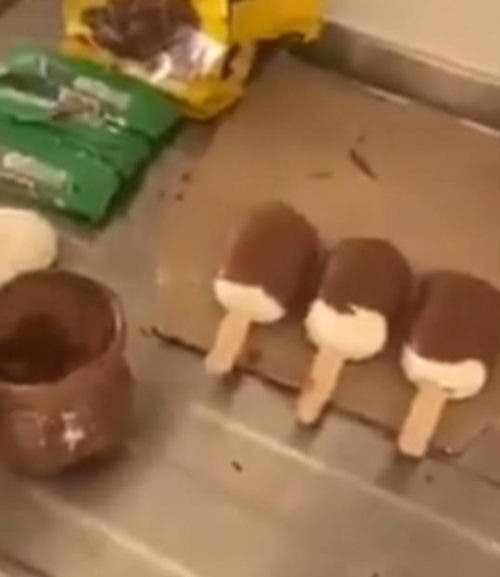 Se observa cómo acude a comprar el producto de higiene, los abre, les coloca paletas de madera y derrite chocolate de repostería para cubrir los jabones y así darles el aspecto de un helado. Una vez que terminó el procedimiento de transformar las barras de jabón en “deliciosas paletas de helado” se dirigió a la calle para abordar a personas mayores y regalarles el supuesto postre para que lo degustaran.