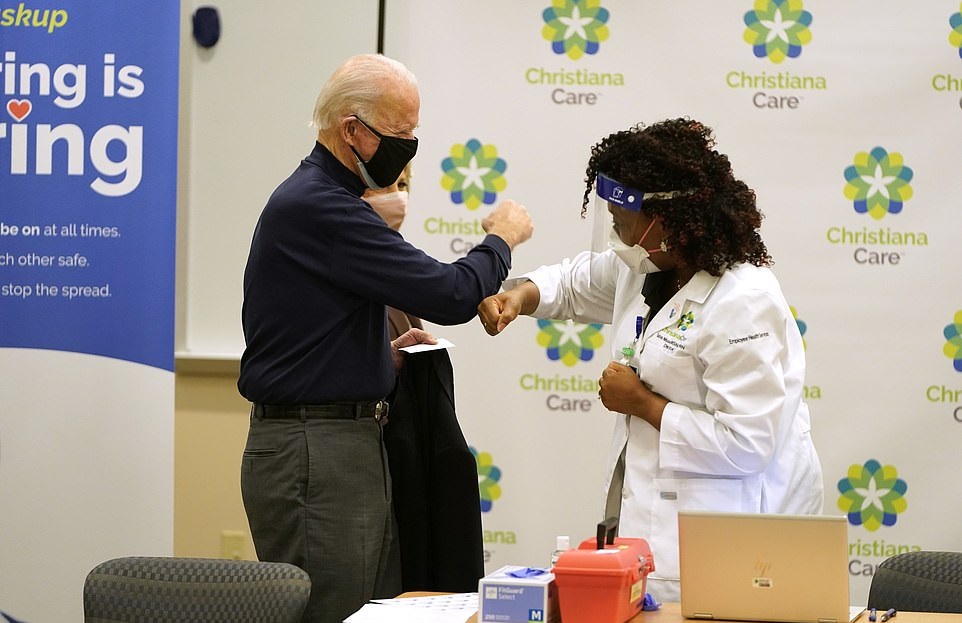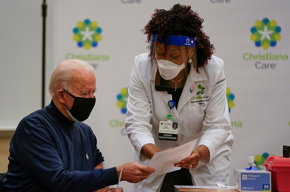 “Estoy listo. Simplemente siga adelante…”, le dijo Biden a la enfermera especializada y directora de servicios de salud para empleados, Tabe Mase, mientras se preparaba para administrarle la vacuna.