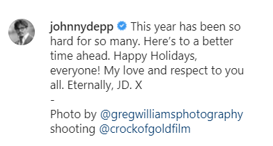 “Este año ha sido muy difícil para muchos, pero tenemos un mejor momento por delante. ¡Felices fiestas a todos! Mi amor y respeto para todos ustedes. Eternamente, JD. X ”, escribió Depp.