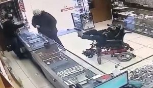 Este es el momento en que un adolescente sordomudo en silla de ruedas intentó robar una joyería en Brasil apuntando con un arma falsa con los pies.