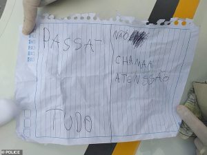 El asombroso incidente se desarrolló en una tienda en Canela, Rio Grande de Sul, cuando el joven de 19 años colocó una nota amenazante en el mostrador con los pies.