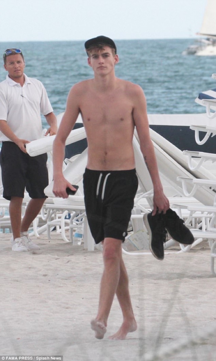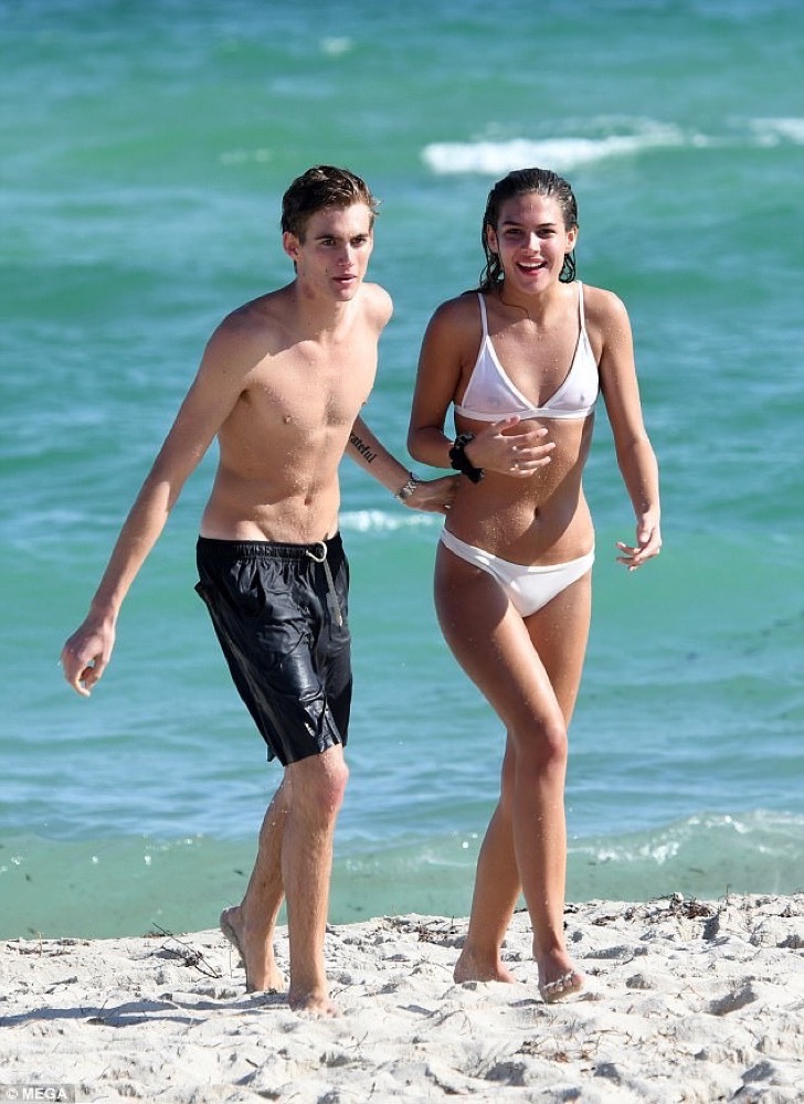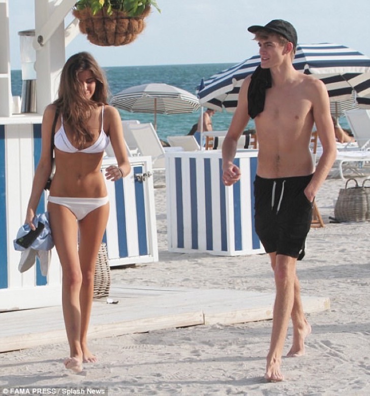 © AM/Splash NewsEl joven que tiene un gran parecido a su padre fue visto disfrutando de la playa con una jovencita que tiene un gran parecido a Cindy Crawford.