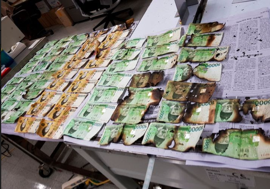 El funcionario del banco SeoJee Woun dijo que el número de billetes de 50.000 wones que el banco cambió a la mitad del valor fue de 507. Dijo que el banco no cuenta el número de billetes que no puede cambiar porque el daño es demasiado grande.