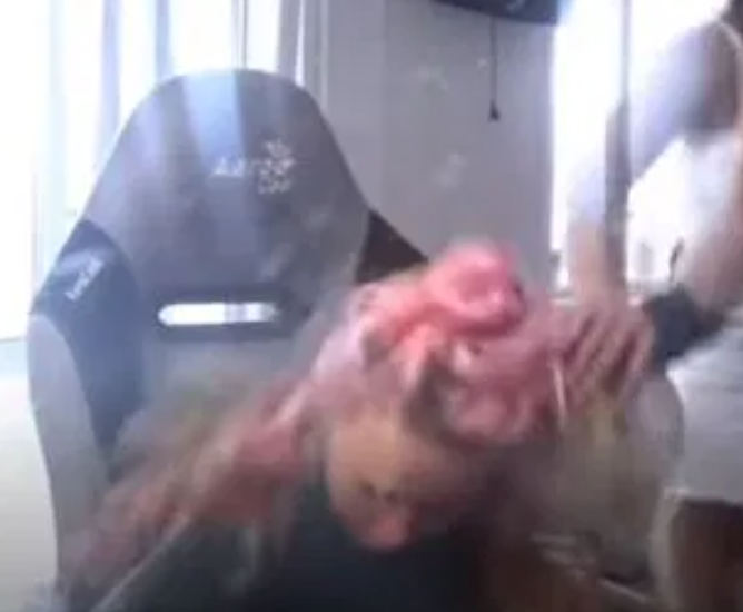Valentina grita mientras Reeflay se sienta con dos de sus amigos, solo para que él se levante de la silla y la rocíe de nuevo mientras ella jadea por respirar.