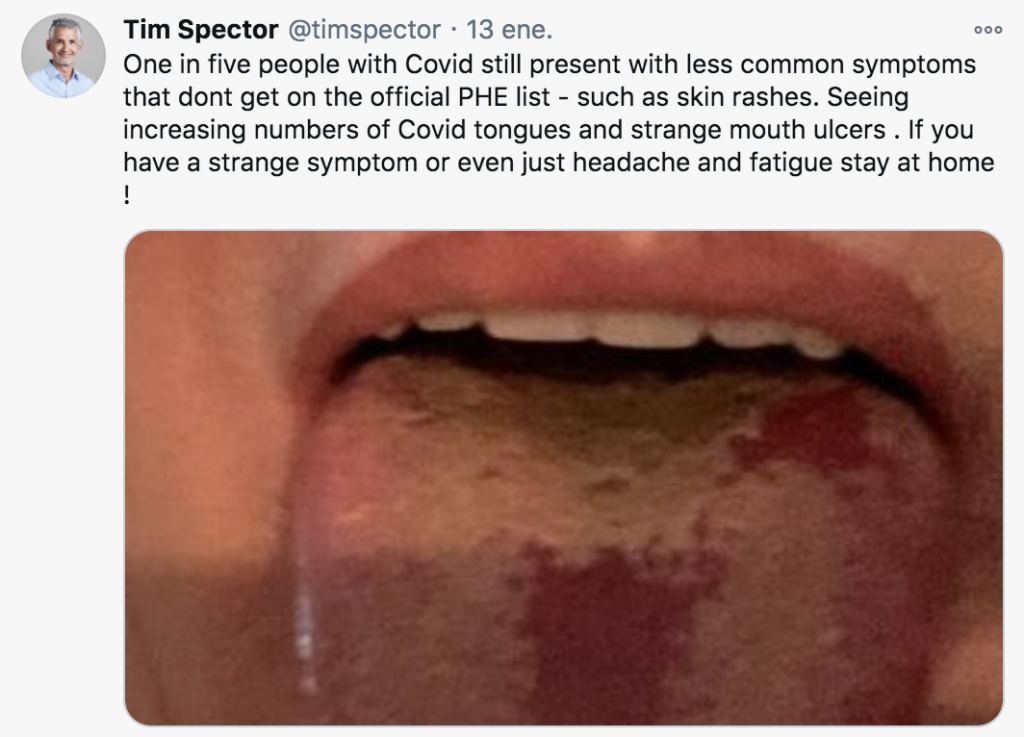 El experto británico Tim Spector alertó que se está “observando un creciente número de lenguas covid-19 y extrañas úlceras bucales”, publicando fotos en Twitter.